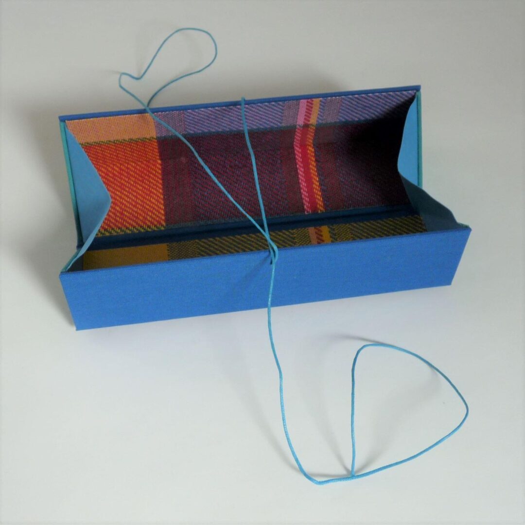 Door de linnen scharnieren kan het langwerpige doosje goed openliggen. Het doosje is geschikt voor schrijfgerei, haaknaalden of je vouwbenen, prikpennen…