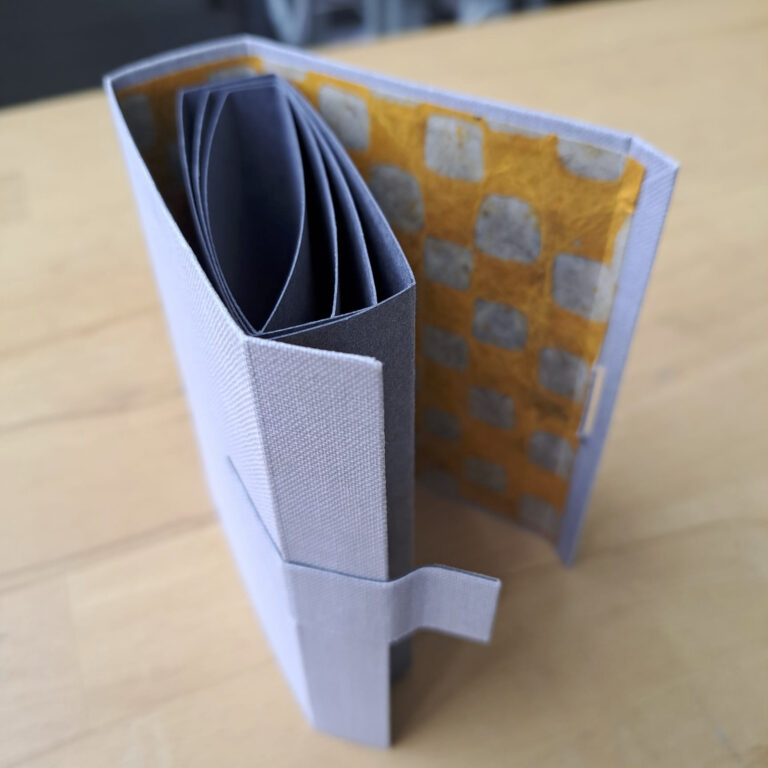 Alsof je een bonbon uitpakt… geen gewone band om een boekje, maar een feestelijke verpakking met zorgvuldig gevouwen doorkijkjes. Docent: Wilma van Driel