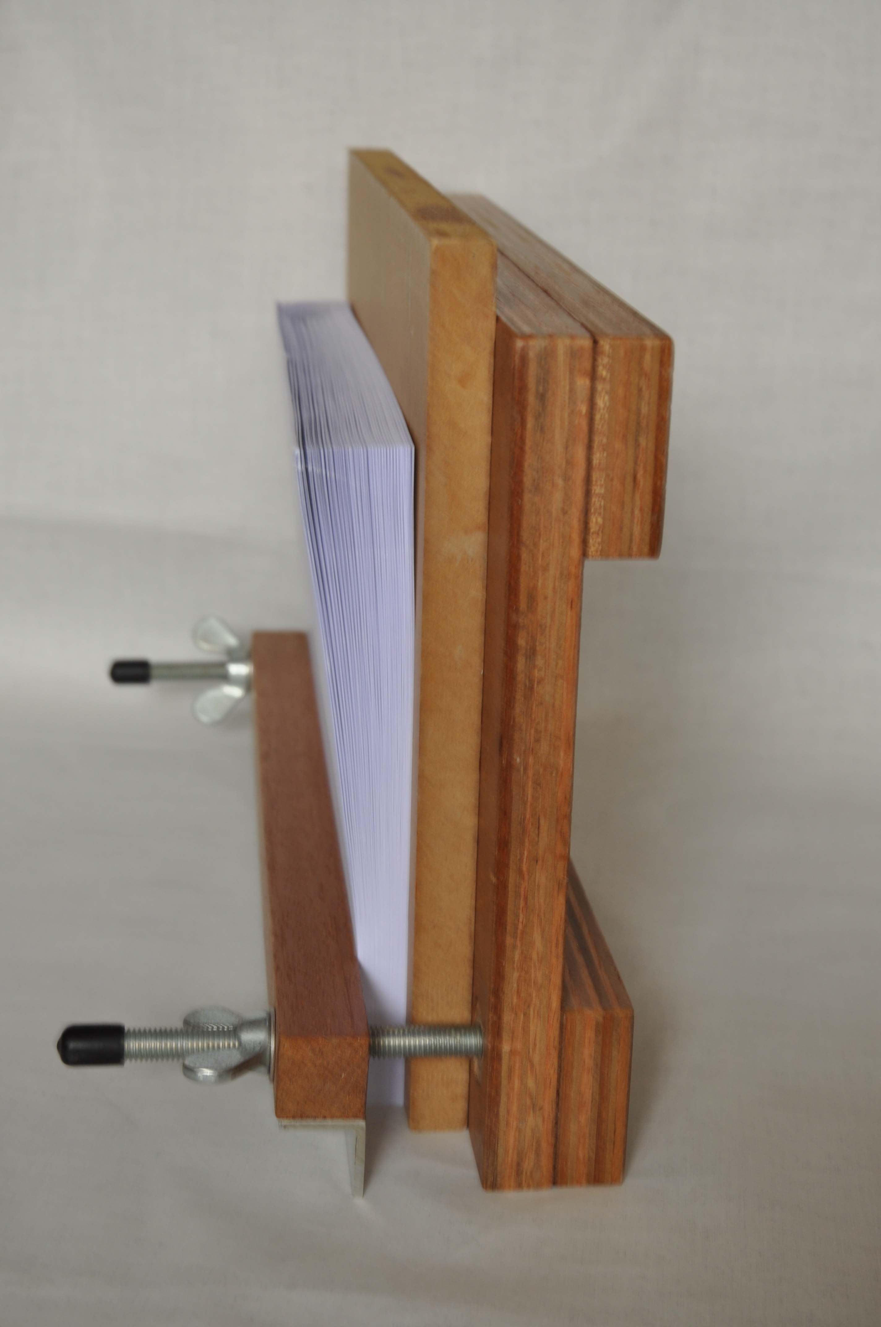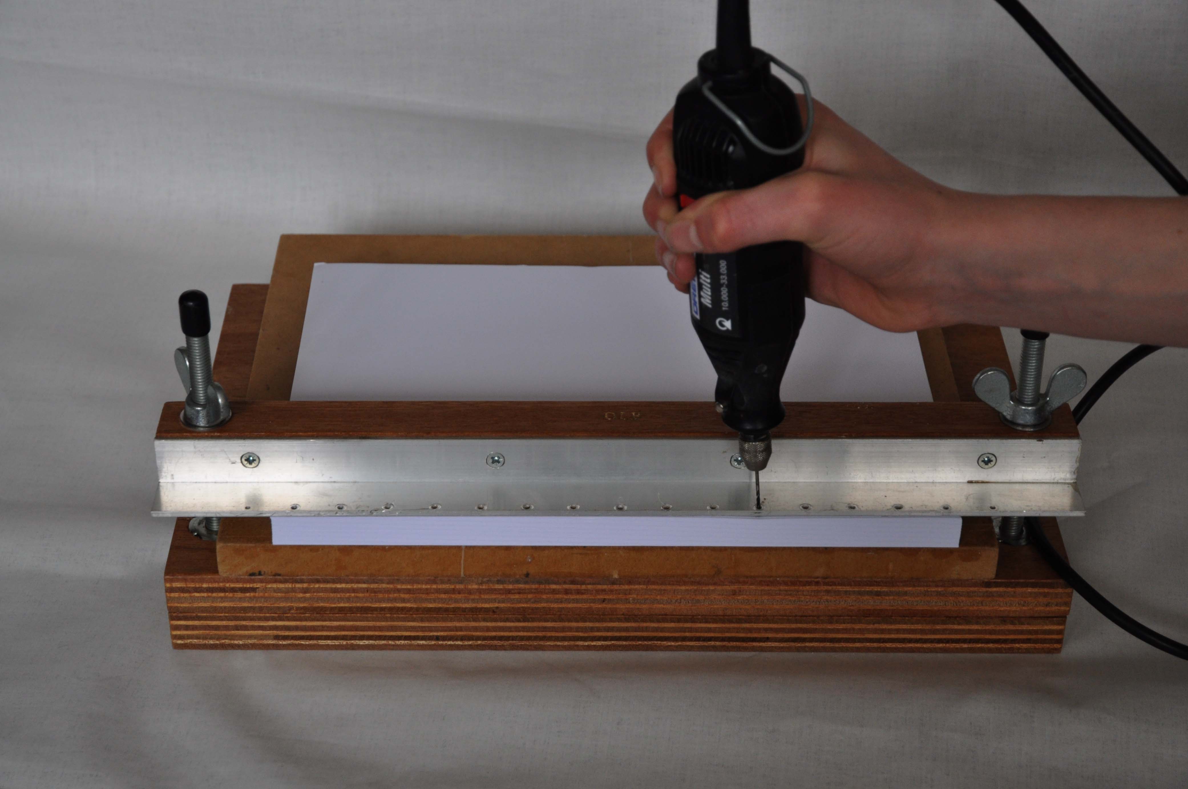 Zorg dat de losse bladen goed recht liggen en schoon zijn aan de rugzijde. Voeg voor en achter een extra (mors)vel toe. Leg de stapel nu in de mal. Leg een extra plankje onder de vellen zodat je tijdens het boren geen gaten in je mal maakt. Let goed op de verdeling van de naaigaten. Hou rekening met de snijmarges aan kop en staart! Kantel de hele mal zodat de rug op de tafel ligt en stoot het geheel goed recht. Draai de vleugelmoeren aan en kantel de mal weer recht