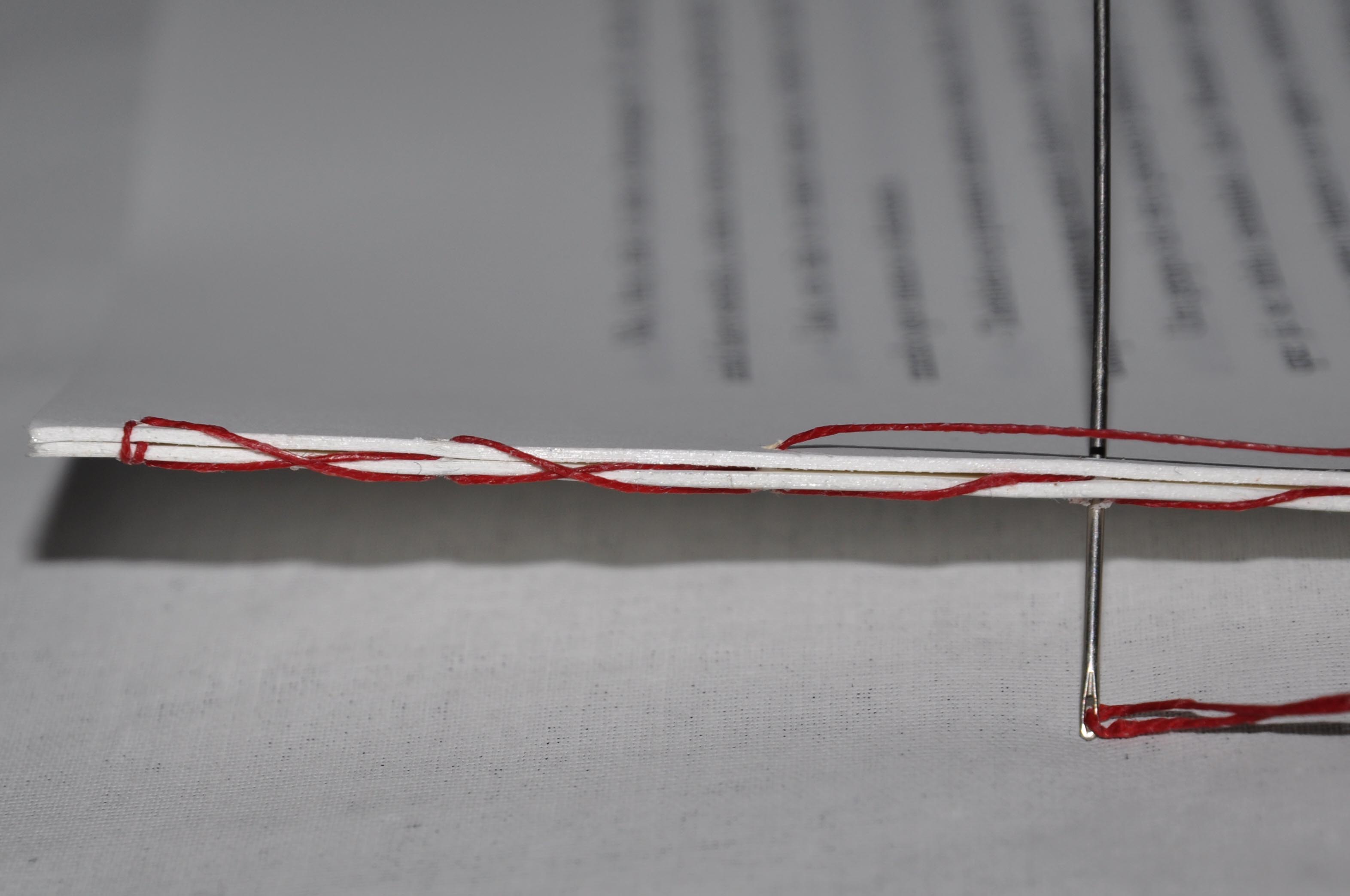Bij de kop aangekomen kom je uit aan de bovenzijde van het katern en nu ga je nogmaals door hetzelfde gat om de draad te fixeren. (foto hieronder, links), N.B. Voor de betere zichtbaarheid is hier dik rood garen gebruikt).